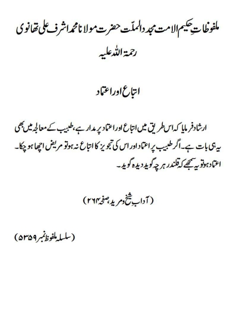 ارشاد فرمایا کہ اس طریق میں اتباع اور اعتماد پر مدار ہے، طبیب کے معالجہ میں بھی یہ ہی بات ہے۔اگر طبیب پر اعتماد اور اس کی تجویز کا اتباع نہ ہو تو مریض اچھا ہوچکا۔ اعتماد ہو تو یہ سمجھے کہ قلندر ہر چہ گوید دیدہ گوید۔(آداب ِ شیخ و مرید، صفحہ ۲۶۴)