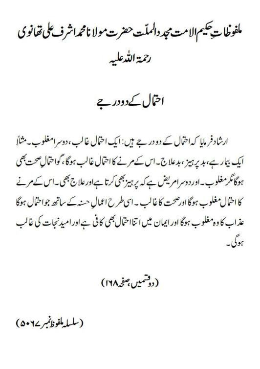 ارشاد فرمایا کہ احتمال کے دو درجے ہیں: ایک احتمال غالب، دوسرا مغلوب۔ مثلاً ایک بیمار ہے، بد پرہیز، بد علاج ۔ اس کے مرنے کا احتمال غالب ہوگا ، گو احتمالِ صحت بھی ہوگا مگر مغلوب ۔ اور دوسرا مریض ہے کہ پرہیز بھی کرتا ہے اور علاج بھی۔ اس کے مرنے کا احتمال مغلوب ہوگا اور صحت کا غالب ۔ اسی طرح اعمالِ حسنہ کے ساتھ جو احتمال ہوگا عذاب کا وہ مغلوب ہوگا اور ایمان میں اتنا احتمال بھی کافی ہے اور امید نجات کی غالب ہوگی۔(دو قسمیں، صفحہ ۱۶۸)