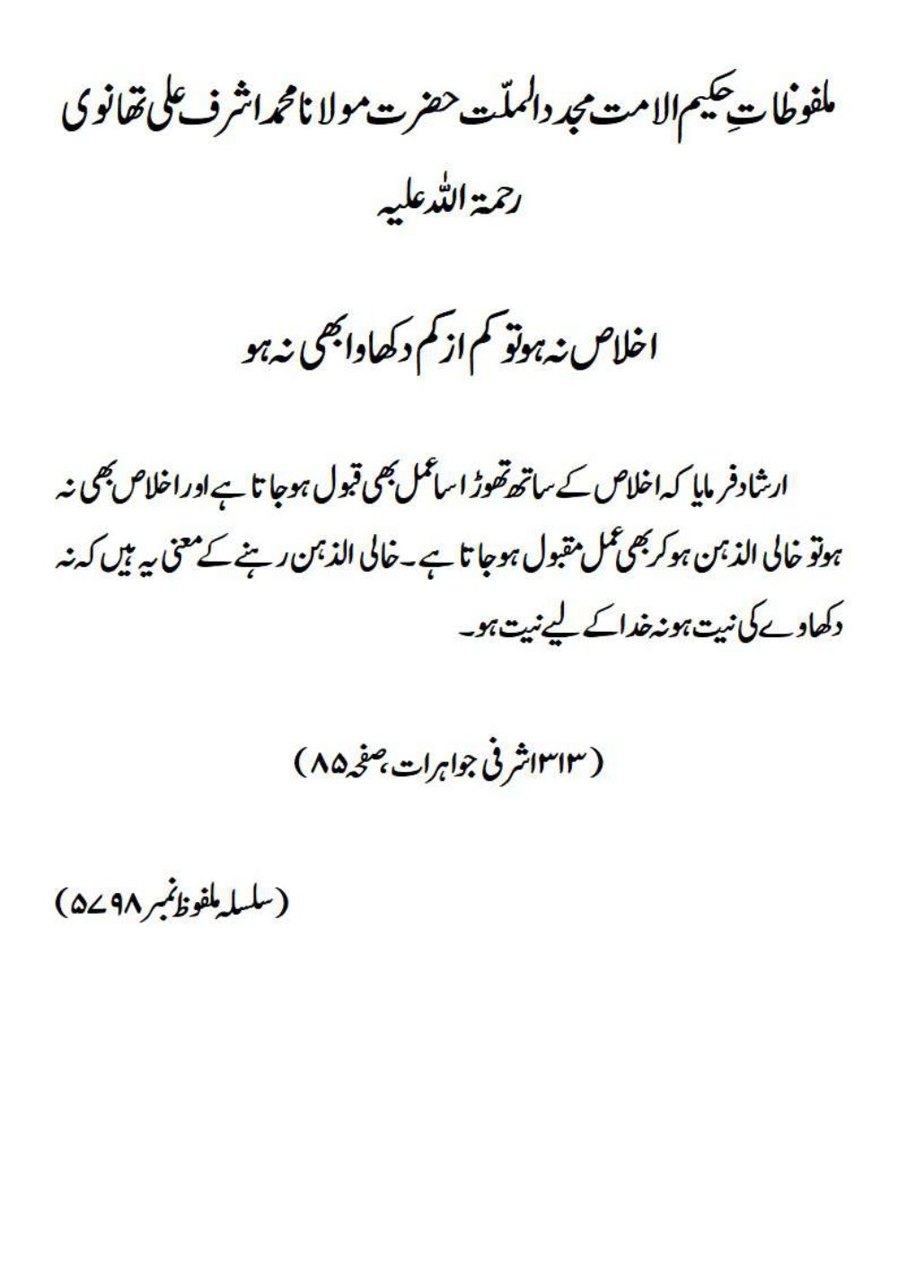 ارشاد فرمایا کہ اخلاص کے ساتھ تھوڑا سا عمل بھی قبول ہوجاتا ہے اور اخلاص بھی نہ ہو تو خالی الذہن ہو کر بھی عمل مقبول ہوجاتا ہے ۔ خالی الذہن رہنے کے معنی یہ ہیںکہ نہ دکھاوے کی نیت ہو نہ خدا کے لیے نیت ہو۔(۳۱۳ اشرفی جواہرات، صفحہ ۸۵)