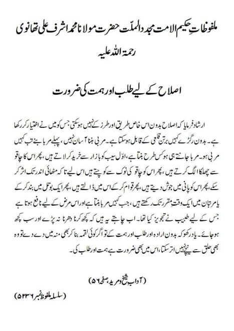 ارشاد فرمایا کہ اصلاح بدون اس خاص طریق اور طرز کے نہیں ہوسکتی جس کو میں نے اختیار کر رکھا ہے ۔ بدون رگڑے کہیں برتن قلعی کے قابل ہوسکتا ہے ۔ مربی بننا آسان نہیں ، پہلے مربابنے تب کہیں مربی ہو۔ مربا جانتے ہی ہو کس طرح بنتا ہے ، اوّل سیب کو بازار سے خرید کر لاتے ہیں ، پھر اس کا چاقو سے چھلکا الگ کرتے ہیں ، پھر اس کو چاقو کی نوک سے کوچتے ہیںاس لیے تاکہ مٹھائی اندر تک اثر کر سکے ، پھر اس کو پانی میں جوش دیتے ہیں ، پھر قوام کرکے اس میں ڈالتے ہیں ، پھر ایک بوتل میں بند کرکے یا مرتبان میں ایک وقت ِ مقرر تک رکھتے ہیں ، جب کہیں مربا بنتا ہے اور اس مرض کے لیے نافع ہوتا ہے جس کے لیے طبیب نے تجویز کیا تھا۔ اب چاہتے یہ ہیں کہ کچھ کرنا دھرنا نہ پڑے اور سب کچھ ہوجائے۔ یاد رکھو کہ بدون ارادہ اور طلب اور ہمت کے تو اگر کوئی لقمہ بنا کر بھی منہ میں دے دے تو وہ بھی حلق سے نیچے نہیں اتر سکتا، اس میں بھی ضرورت ہے ہمت اور طلب کی۔(آداب ِ شیخ و مرید، صفحہ ۵۶)