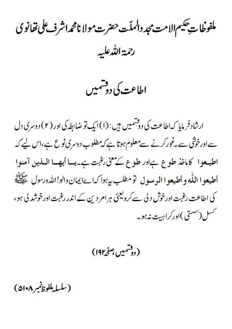 ارشاد فرمایا کہ اطاعت کی دو قسمیں ہیں: (۱) ایک تو ضابطہ کی اور (۲) دوسری دل سے اور خوشی سے۔ غور کرنے سے معلوم ہوتا ہے کہ مطلوب دوسری نوع ہے ، اس لیے کہ اطیعوا کا ماخذ طوع ہے اور طوع کے معنی رغبت ہے۔ یا أیھا الذین آمنوا أطیعوا اللّٰہ وأطیعوا الرسول تو مطلب یہ ہوا کہ اے ایمان والو! اللہ و رسول ﷺ کی اطاعت رغبت اور خوش دلی سے کرو یعنی ہر امر دین کے اندر رغبت اور خوشدلی ہو ، کسل(سستی) اور کراہیت نہ ہو۔(دو قسمیں، صفحہ ۱۹۲)