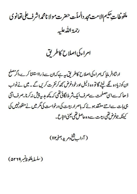 ارشاد فرمایا کہ امراء کی اصلاح کا طریق یہ ہے کہ ان سے ذرا استغنا کرے، اگر مصلح ان کو زیادہ لگے لپٹے گا تو وہ ذلیل اور خود غرض سمجھ کر نفرت کریں گے ۔ میں نے نواب ڈھاکہ سے اسی مصلحت سے صرف ایک شرط لگائی تھی کہ کچھ ہدیہ پیش نہ کرنا۔ صرف اتنی ہی بات سے اتنے معتقد ہوئے کہ باصرار بیعت کی درخواست کی مگر میں نے منظور نہیں کی کیونکہ جو غرض تھی بیعت سے وہ حاصل تھی یعنی اتباع۔(آداب ِ شیخ و مرید، صفحہ ۱۱۲)