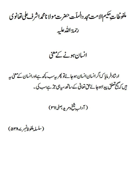 ارشاد فرمایا کہ اگر انسان انسان ہوجائے تو پھر یہ سب کچھ ہے اور انسان کے معنی یہ ہیں کہ صحیح تعلق پیدا ہوجائے حق تعالیٰ کے ساتھ ، یہ ہی جڑ ہے سب کی۔(آداب ِ شیخ و مرید، صفحہ ۳۱۱)