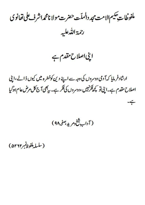 ارشاد فرمایا کہ آدمی دوسروں کی وجہ سے اپنے دین کو خطرہ میں کیوں ڈالے ، اپنی اصلاح مقدم ہے۔اپنی تو کچھ فکر نہیں ، دوسروں کی فکر ہے۔ یہ بھی آج کل مرض عام ہوگیا ہے۔(آداب ِ شیخ و مرید، صفحہ ۹۸)