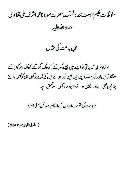 ارشاد فرمایا کہ بدعتی تو ایسے ہیں جیسے گھر کے کچھ لوگ بگڑ گئے کیونکہ بزرگوں کے معتقد تو ہیں اور غیر مقلد ایسے ہیں جیسے غیر ہوتے ہیں کیونکہ بزرگوں ہی کو نہیں مانتے چنانچہ بدعتی بے ادب نہیں ہوتے ، ان کو بزرگوں سے تعلق ہے ۔(بدعت کی حقیقت اور اس کے احکام و مسائل، صفحہ ۲۹)
