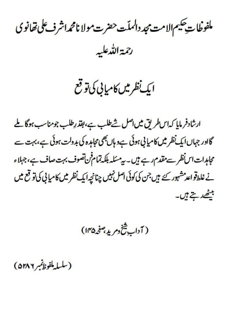 ارشاد فرمایا کہ اس طریق میں اصل شے طلب ہے ، بقدرِ طلب جو مناسب ہوگا ملے گا اور جہاں ایک نظر میں کامیابی ہوئی ہے وہاں بھی مجاہدہ کی بدولت ہوئی ہے ، بہت سے مجاہدات اس نظر سے مقدم رہے ہیں ۔ یہ مسئلہ بلکہ تمام فن تصوف بہت صاف ہے ، جہلاء نے غلط قواعد مشہور کئے ہیں جن کی کوئی اصل نہیں چنانچہ ایک نظر میں کامیابی کی توقع میں بیٹھے رہتے ہیں۔(آداب ِ شیخ و مرید، صفحہ ۱۴۵)