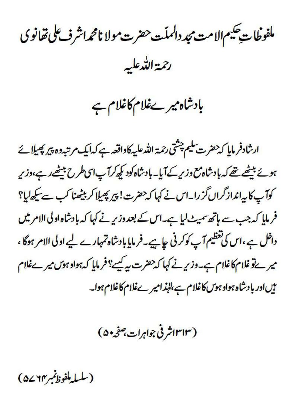 ارشاد فرمایا کہ حضرت سلیم چشتی رحمۃ اللہ علیہ کا واقعہ ہے کہ ایک مرتبہ وہ پیر پھیلائے ہوئے بیٹھے تھے کہ بادشاہ مع وزیر کے آیا۔ بادشاہ کو دیکھ کر آپ اسی طرح بیٹھے رہے ، وزیر کو آپ کا یہ انداز گراں گزرا۔ اس نے کہا کہ حضرت ! پیر پھیلا کر بیٹھنا کب سے سیکھ لیا؟ فرمایا کہ جب سے ہاتھ سمیٹ لیا ہے۔اس کے بعد وزیر نے کہا کہ بادشاہ اولی الامر میں داخل ہے ، اس کی تعظیم آپ کو کرنی چاہیے۔ فرمایا بادشاہ تمہارے لیے اولی الامر ہوگا ، میرے تو غلام کا غلام ہے۔ وزیر نے کہا کہ حضرت یہ کیسے؟ فرمایا کہ ہوا و ہوس میرے غلام ہیںاور بادشاہ ہوا وہوس کا غلام ہے ، لہٰذا میرے غلام کا غلام ہوا۔(۳۱۳ اشرفی جواہرات، صفحہ ۵۰)