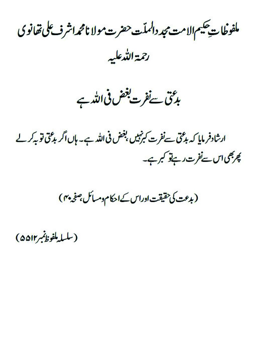 ارشاد فرمایا کہ بدعتی سے نفرت کبر نہیں ، بغض فی اللہ ہے ۔ ہاں اگر بدعتی توبہ کرلے پھر بھی اس سے نفرت رہے تو کبر ہے۔(بدعت کی حقیقت اور اس کے احکام و مسائل، صفحہ ۴۰)