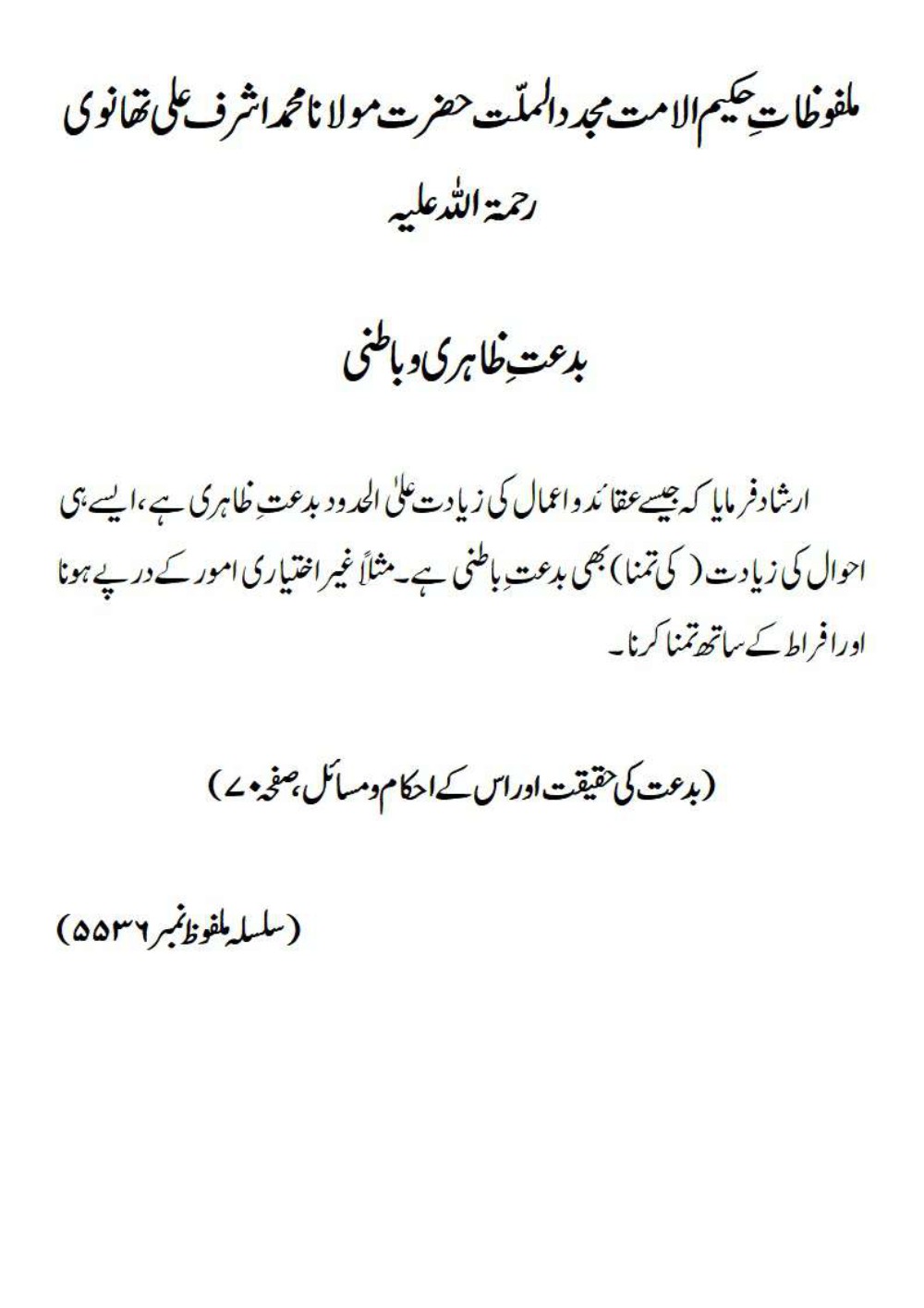ارشاد فرمایا کہ جیسے عقائد و اعمال کی زیادت علیٰ الحدود بدعت ِ ظاہری ہے ، ایسے ہی احوال کی زیادت (کی تمنا)بھی بدعت ِ باطنی ہے۔ مثلاً غیر اختیاری امور کے درپے ہونا اور افراط کے ساتھ تمنا کرنا۔(بدعت کی حقیقت اور اس کے احکام و مسائل، صفحہ ۷۰)