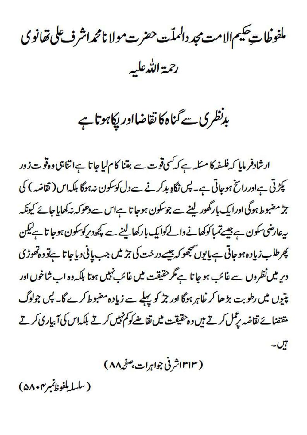 ارشاد فرمایا کہ فلسفہ کا مسئلہ ہے کہ کسی قوت سے جتنا کام لیا جاتا ہے اتنا ہی وہ قوت زور پکڑتی ہے اور راسخ ہوجاتی ہے ۔ پس نگاہِ بد کرنے سے دل کو سکون نہ ہوگابلکہ اس (تقاضہ) کی جڑ مضبوط ہوگی اور ایک بار گھور لینے سے جو سکون ہوجاتا ہے اس سے دھوکہ نہ کھایا جائے کیونکہ یہ عارضی سکون ہے جیسے تمباکو کھانے والے کو ایک بار کھا لینے سے کچھ دیر کو سکون ہو جاتا ہے لیکن پھر طلب زیادہ ہو جاتی ہے یا یوں سمجھو کہ جیسے درخت کی جڑ میں جب پانی دیا جاتا ہے تو وہ تھوڑی دیر میں نظروں سے غائب ہو جاتا ہے مگر حقیقت میں غائب نہیں ہوتا بلکہ وہ اب شاخوں اور پتیوں میں رطوبت بڑھا کر ظاہر ہوگا اور جڑ کو پہلے سے زیادہ مضبوط کرے گا۔ پس جو لوگ مقتضائے تقاضہ پر عمل کرتے ہیں وہ حقیقت میں تقاضے کو کم نہیں کرتے بلکہ اس کی آبیاری کرتے ہیں۔(۳۱۳ اشرفی جواہرات، صفحہ ۸۸)