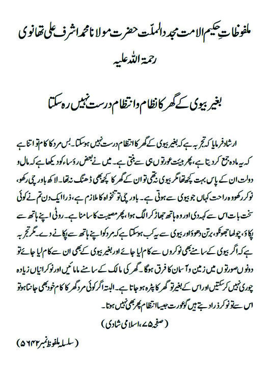ارشاد فرمایا کہ تجربہ ہے کہ بغیر بیوی کے گھر کا انتظام درست نہیں ہو سکتا ۔ بس مرد کا کام تو اتنا ہے کہ یہ مادہ جمع کر دیتا ہے ، پھر ہیئت عورتوں ہی سے بنتی ہے۔ میں نے بعض رؤساء کو دیکھا ہے کہ مال و دولت ان کے پاس بہت کچھ تھا مگر بیوی نہ تھی تو ان کے گھر کا کچھ بھی ڈھنگ نہ تھا۔ لاکھ باورچی رکھو، نوکر رکھو وہ راحت کہاں جو بیوی سے ہوتی ہے ۔ باورچی تو تنخواہ کا ملازم ہے ، ذرا ایک دن تم نے کوئی سخت بات اس سے کہہ دی اور وہ ہاتھ جھاڑ کر الگ ہوا ، پھر مصیبت کا سامنا ہے ۔ روٹی اپنے ہاتھ سے پکاؤ ، چولھا جھونکو، برتن دھوؤ اور بیوی سے یہ کب ہوسکتا ہے کہ مرد کو اپنے ہاتھ سے پکانے دے۔ مگر تجربہ ہے کہ اگر بیوی کے سامنے بھی نوکروں سے کام لیا جائے اور بغیر بیوی کے بھی ان سے کام لیا جائے تو دونوں صورتوں میں زمین و آسمان کا فرق ہوگا ۔ گھر کی مالک کے سامنے مامائیں اور نوکرانیاں زیادہ چوری نہیں کر سکتیں اور اس کے بغیر تو گھر کا پٹرہ ہوجاتا ہے۔ البتہ اگر کوئی مرد گھر کا کام خود بھی جانتا ہو تو اس سے تو نوکر ذرا دبتے ہیں گو عورت جیسا انتظام پھر بھی نہیں ہوتا۔(صفحہ ۷۵،اسلامی شادی)