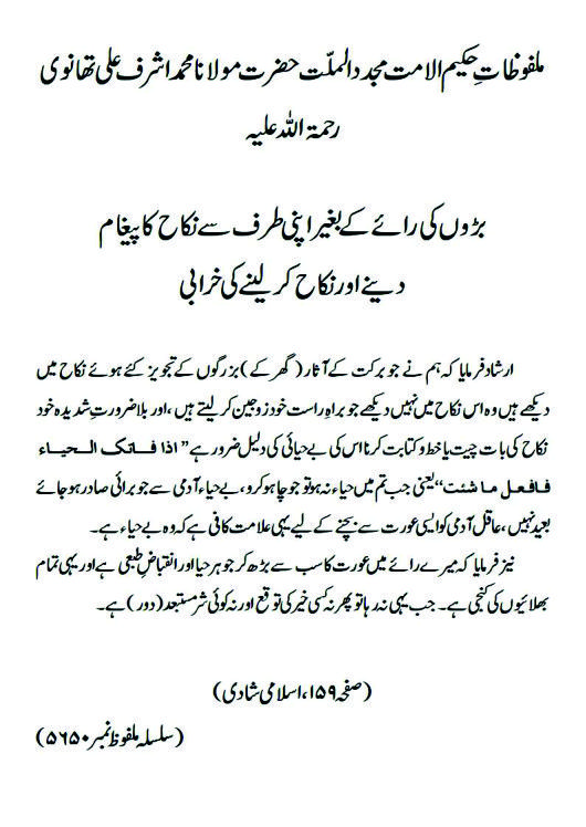 ارشاد فرمایا کہ ہم نے جو برکت کے آثار (گھر کے) بزرگوں کے تجویز کئے ہوئے نکاح میں دیکھے ہیں وہ اس نکاح میں نہیں دیکھے جو براہِ راست خود زوجین کر لیتے ہیں ، اور بلا ضرورتِ شدیدہ خود نکاح کی بات چیت یا خط و کتابت کرنا اس کی بے حیائی کی دلیل ضرور ہے ’’ اذا فاتک الحیاء فافعل ما شئت‘‘ یعنی جب تم میں حیاء نہ ہو تو جو چاہو کرو ، بے حیاء آدمی سے جو برائی صادر ہوجائے بعید نہیں، عاقل آدمی کو ایسی عورت سے بچنے کے لیے یہی علامت کافی ہے کہ وہ بے حیاء ہے۔