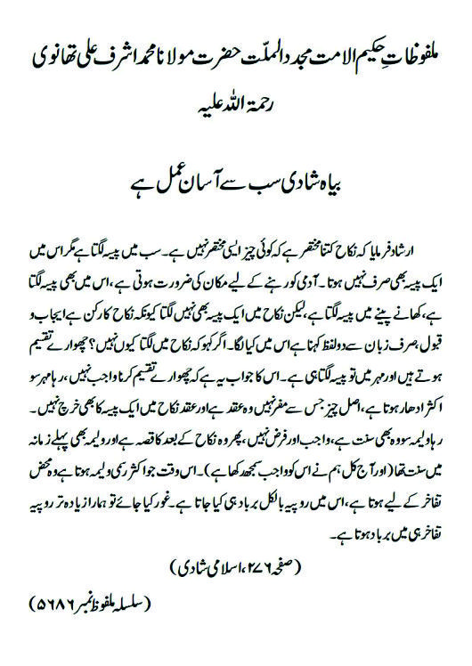 ارشاد فرمایا کہ نکاح کتنا مختصر ہے کہ کوئی چیز ایسی مختصر نہیں ہے ۔ سب میں پیسہ لگتا ہے مگر اس میں ایک پیسہ بھی صرف نہیں ہوتا ۔ آدمی کو رہنے کے لیے مکان کی ضرورت ہوتی ہے ، اس میں بھی پیسہ لگتا ہے، کھانے پینے میں پیسہ لگتا ہے ، لیکن نکاح میں ایک پیسہ بھی نہیں لگتاکیونکہ نکاح کا رکن ہے ایجاب و قبول ، صرف زبان سے دو لفظ کہنا ہے اس میں کیا لگا۔ اگر کہو کہ نکاح میں لگتا کیوں نہیں ؟ چھوارے تقسیم ہوتے ہیں اور مہر میں تو پیسہ لگتا ہی ہے ۔ اس کا جواب یہ ہے کہ چھوارے تقسیم کرنا واجب نہیں ، رہا مہر سو اکثر ادھار ہوتا ہے ، اصل چیز جس سے مفر نہیں وہ عقد ہے اور عقد نکاح میں ایک پیسہ کا بھی خرچ نہیں ۔ رہا ولیمہ سو وہ بھی سنت ہے، واجب اور فرض نہیں ، پھر وہ نکاح کے بعد کا قصہ ہے اور ولیمہ بھی پہلے زمانہ میں سنت تھا(اور آج کل ہم نے اس کو واجب سمجھ رکھا ہے)۔ اس وقت جو اکثر رسمی ولیمہ ہوتا ہے وہ محض تفاخر کے لیے ہوتا ہے ، اس میں روپیہ بالکل برباد ہی کیا جاتا ہے ۔ غور کیا جائے تو ہمارا زیادہ تر روپیہ تفاخر ہی میں برباد ہوتا ہے۔(صفحہ ۲۷۶،اسلامی شادی)