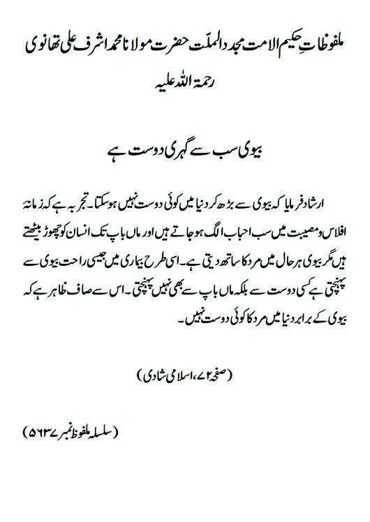 ارشاد فرمایا کہ بیوی سے بڑھ کر دنیا میں کوئی دوست نہیں ہوسکتا ۔ تجربہ ہے کہ زمانۂ افلاس و مصیبت میں سب احباب الگ ہو جاتے ہیں اور ماں باپ تک انسان کو چھوڑ بیٹھتے ہیں مگر بیوی ہر حال میں مرد کا ساتھ دیتی ہے۔اسی طرح بیماری میں جیسی راحت بیوی سے پہنچتی ہے کسی دوست سے بلکہ ماں باپ سے بھی نہیں پہنچتی ۔ اس سے صاف ظاہر ہے کہ بیوی کے برابر دنیا میں مرد کا کوئی دوست نہیں۔(صفحہ ۷۲،اسلامی شادی)