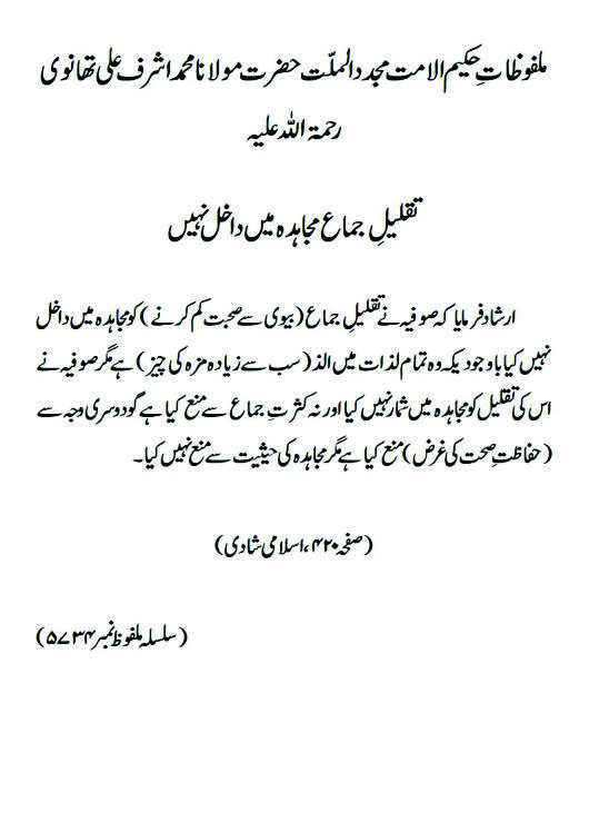 ارشاد فرمایا کہ صوفیہ نے تقلیلِ جماع(بیوی سے صحبت کم کرنے ) کو مجاہدہ میں داخل نہیں کیا باوجودیکہ وہ تمام لذات میں الذ(سب سے زیادہ مزہ کی چیز) ہے مگر صوفیہ نے اس کی تقلیل کو مجاہدہ میں شمار نہیں کیا اور نہ کثرتِ جماع سے منع کیا ہے گو دوسری وجہ سے (حفاظت ِ صحت کی غرض ) منع کیا ہے مگر مجاہدہ کی حیثیت سے منع نہیں کیا۔(صفحہ۴۲۰،اسلامی شادی)