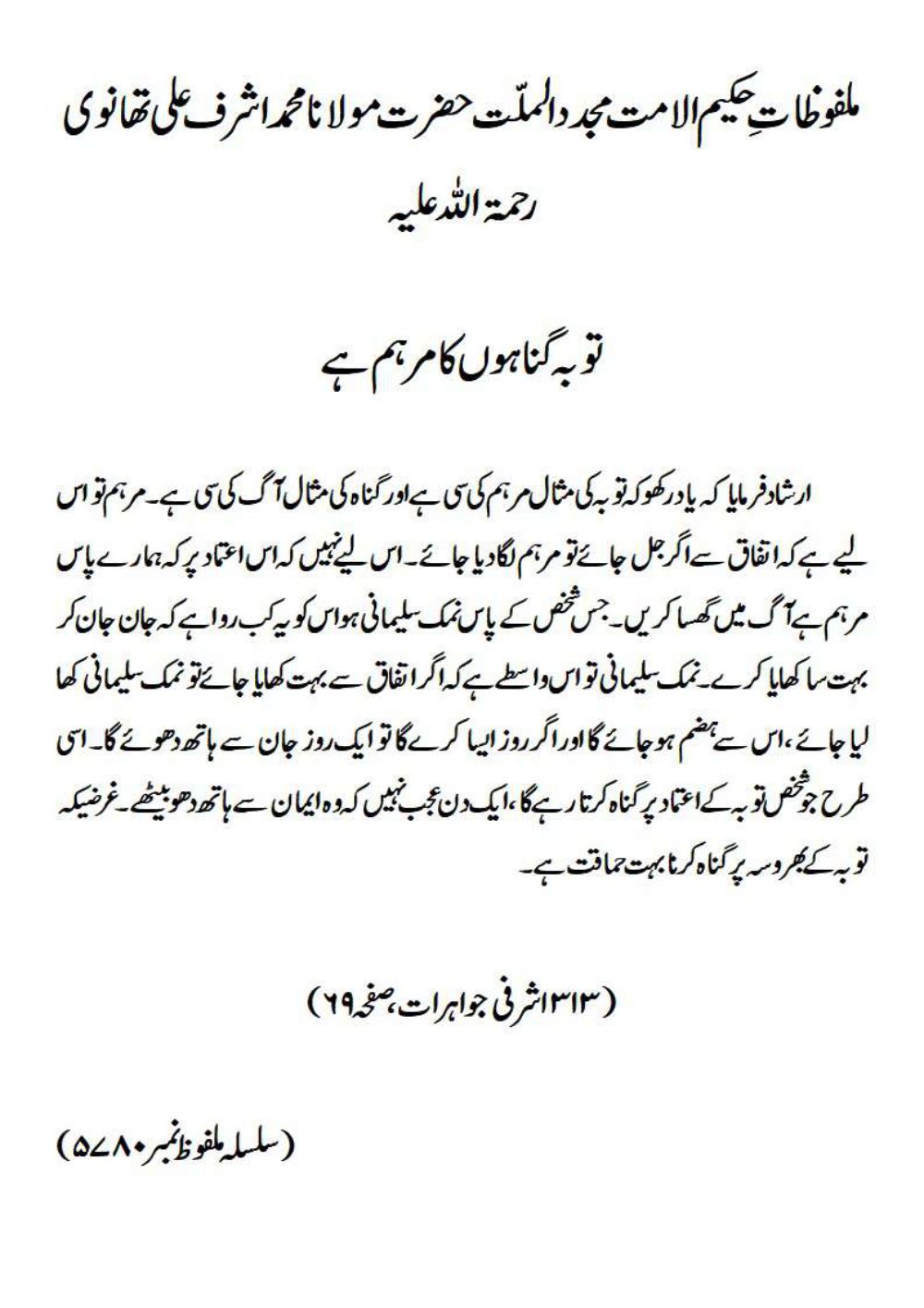 ارشاد فرمایا کہ یاد رکھو کہ توبہ کی مثال مرہم کی سی ہے اور گناہ کی مثال آگ کی سی ہے ۔ مرہم تو اس لیے ہے کہ اتفاق سے اگر جل جائے تو مرہم لگا دیا جائے ۔ اس لیے نہیں کہ اس اعتماد پر کہ ہمارے پاس مرہم ہے آگ میں گھسا کریں۔ جس شخص کے پاس نمک سلیمانی ہو اس کو یہ کب روا ہے کہ جان جان کر بہت سا کھایا کرے ۔ نمک سلیمانی تو اس واسطے ہے کہ اگر اتفاق سے بہت کھایا جائے تو نمک سلیمانی کھا لیا جائے، اس سے ہضم ہو جائے گا اور اگر روز ایسا کرے گا تو ایک روز جان سے ہاتھ دھوئے گا۔ اسی طرح جو شخص توبہ کے اعتماد پر گناہ کرتا رہے گا ، ایک دن عجب نہیں کہ وہ ایمان سے ہاتھ دھو بیٹھے ۔ غرضیکہ توبہ کے بھروسہ پر گناہ کرنا بہت حماقت ہے۔(۳۱۳ اشرفی جواہرات، صفحہ ۶۹)