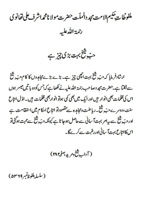 ارشاد فرمایا کہ حبّ ِ شیخ بہت اچھی چیز ہے۔ بڑے بڑے مجاہدوں کا کام حبّ ِ شیخ سے نکلتا ہے۔ حضرت مجدد صاحب رحمۃ اللہ علیہ نے لکھا ہے کہ جس کو دو باتیں میسر ہوں اس کی ظلمات بھی انوار ہیں اور ایک میں بھی کمی ہو تو انوار بھی ظلمات ہیں۔ اوّل اتباعِ سنت، دوسرے حبّ ِ شیخ۔ ریاضت و مجاہدہ سے مقصود تو اتباعِ احکام میں استقامت ہے اور حبّ ِ شیخ سے یہ امر بہت آسانی سے حاصل ہوجاتا ہے کیونکہ حبّ ِ شیخ سے محبت ہوگئی تو اس کا اتباع بہت آسانی اور رغبت سے کرے گا۔(آداب ِ شیخ و مرید، صفحہ ۲۸۲)