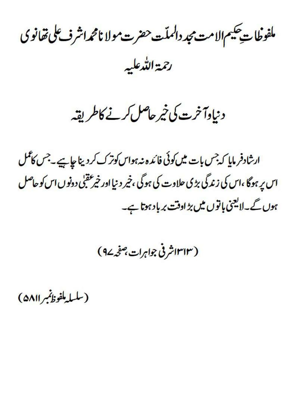 ارشاد فرمایا کہ جس بات میں کوئی فائدہ نہ ہو اس کو ترک کر دینا چاہیے ۔ جس کا عمل اس پر ہوگا ، اس کی زندگی بڑی حلاوت کی ہوگی ، خیر دنیا اور خیر عقبیٰ دونوں اس کو حاصل ہوں گے۔ لا یعنی باتوں میں بڑا وقت برباد ہوتا ہے۔(۳۱۳ اشرفی جواہرات، صفحہ ۹۷)