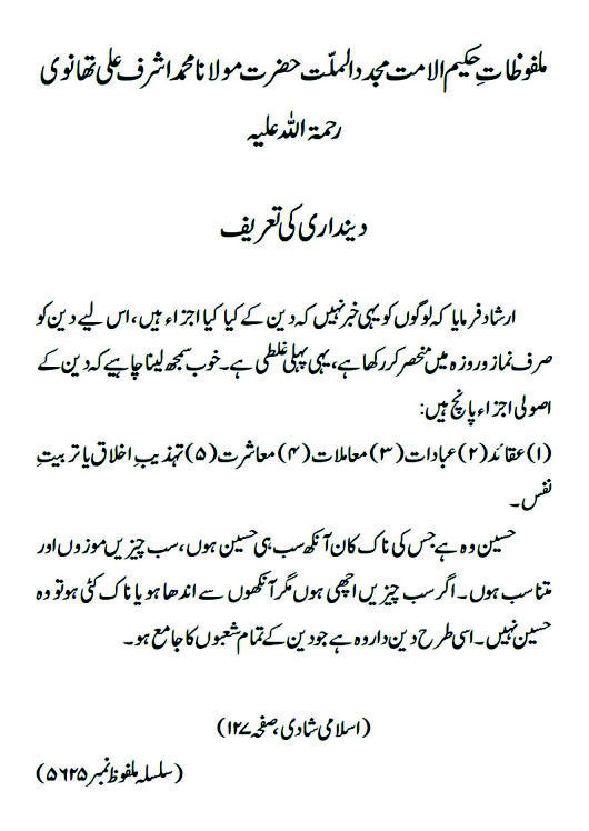 حسین وہ ہے جس کی ناک کان آنکھ سب ہی حسین ہوں ، سب چیزیں موزوں اور متناسب ہوں۔ اگر سب چیزیں اچھی ہوں مگر آنکھوں سے اندھا ہو یا ناک کٹی ہو تو وہ حسین نہیں ۔ اسی طرح دین دار وہ ہے جو دین کے تمام شعبوں کا جامع ہو۔(صفحہ ۱۲۷،اسلامی شادی)