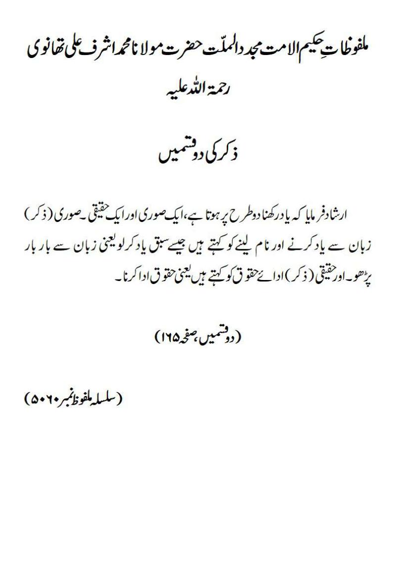ارشاد فرمایا کہ یا د رکھنا دو طرح پر ہوتا ہے ، ایک صوری اور ایک حقیقی۔ صوری(ذکر) زبان سے یاد کرنے اور نام لینے کو کہتے ہیں جیسے سبق یاد کر لو یعنی زبان سے بار بار پڑھو ۔اور حقیقی (ذکر) ادائے حقوق کو کہتے ہیں یعنی حقوق ادا کرنا۔ (دو قسمیں، صفحہ ۱۶۵)