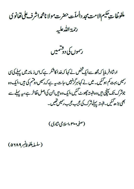 ارشاد فرمایا کہ مجھ سے ایک شخص نے کہا کہ خدا کا شکر ہے کہ اس زمانہ میں پہلے کی سی رسمیں بہت کم ہو گئیں۔ میں نے کہا ہرگز نہیں، بات یہ ہے کہ رسمیں دو قسم کی ہیں ، ایک وہ جو شرک تک پہنچی ہیں وہ البتہ چھوٹ گئیں، ایک وہ ہیں جن کی اصل تفاخر ہے ، یہ پہلے سے بھی بڑھ گئیں ۔ البتہ پہلے شرک کی عجیب عجیب رسمیں تھیں۔(صفحہ ۳۰۰،اسلامی شادی)