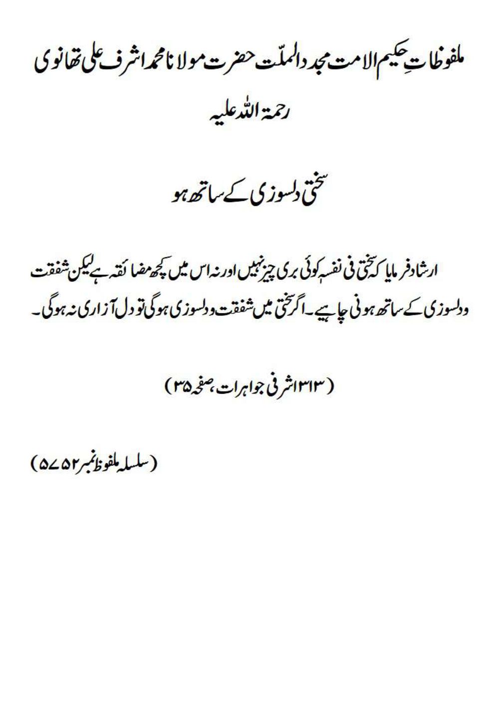 ارشاد فرمایا کہ سختی فی نفسہٖ کوئی بری چیز نہیں اور نہ اس میں کچھ مضائقہ ہے لیکن شفقت و دلسوزی کے ساتھ ہونی چاہیے ۔ اگر سختی میں شفقت و دلسوزی ہوگی تو دل آزاری نہ ہوگی۔(۳۱۳ اشرفی جواہرات، صفحہ ۳۵)