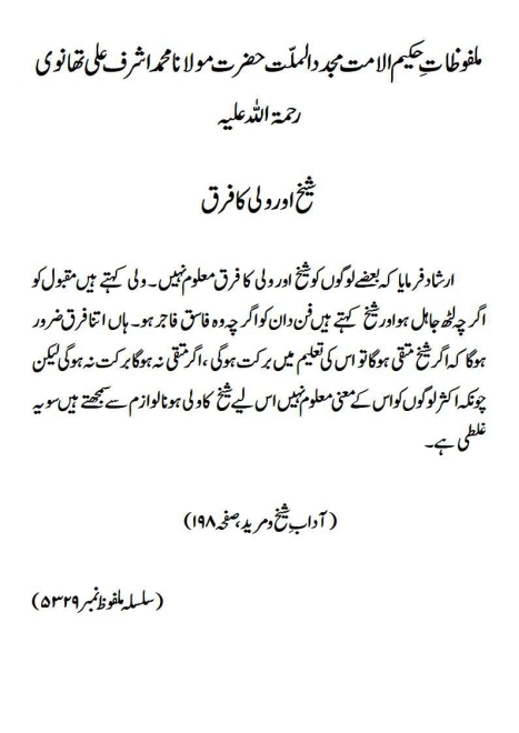 ارشاد فرمایا کہ بعضے لوگوں کو شیخ اور ولی کا فرق معلوم نہیں۔ ولی کہتے ہیں مقبول کو اگرچہ لٹھ جاہل ہو اور شیخ کہتے ہیں فن دان کو اگرچہ وہ فاسق فاجر ہو۔ ہاں اتنا فرق ضرور ہوگا کہ اگر شیخ متقی ہوگا تو اس کی تعلیم میں برکت ہوگی ، اگر متقی نہ ہوگا برکت نہ ہوگی لیکن چونکہ اکثر لوگوں کو اس کے معنی معلوم نہیں اس لیے شیخ کا ولی ہونا لوازم سے سمجھتے ہیں سو یہ غلطی ہے۔(آداب ِ شیخ و مرید، صفحہ ۱۹۸)