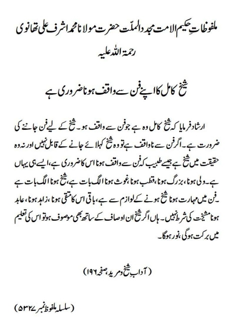 ارشاد فرمایا کہ شیخ کامل وہ ہے جو فن سے واقف ہو ۔ شیخ کے لیے فن جاننے کی ضرورت ہے ۔ اگر فن سے ناواقف ہے تو وہ شیخ کہلائے جانے کے قابل نہیں اور نہ وہ حقیقت میں شیخ ہے جیسے طبیب کہ فن سے واقف ہونا اس کا ضروری ہے، ایسے ہی یہاں ہے ۔ولی ہونا، بزرگ ہونا، قطب ہونا، غوث ہونا الگ بات ہے، شیخ ہونا الگ بات ہے ۔ فن میں مہارت ہونا شیخ ہونے کے لوازم سے ہے ، باقی اس کا متقی ہونا ، زاہد ہونا، عابد ہونا مشیخت کی شرط نہیں۔ ہاں اگر شیخ ان اوصاف کے ساتھ بھی موصوف ہو تو اس کی تعلیم میں برکت ہوگی، نور ہوگا ۔(آداب ِ شیخ و مرید، صفحہ ۱۹۶)