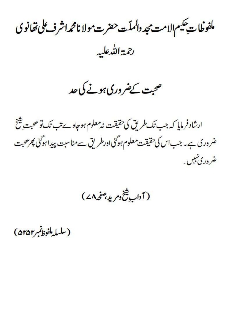 ارشاد فرمایا کہ جب تک طریق کی حقیقت نہ معلوم ہوجاوے تب تک تو صحبت ِ شیخ ضروری ہے ۔ جب اس کی حقیقت معلوم ہو گئی اور طریق سے مناسبت پیدا ہوگئی پھر صحبت ضروری نہیں۔(آداب ِ شیخ و مرید، صفحہ ۷۸)