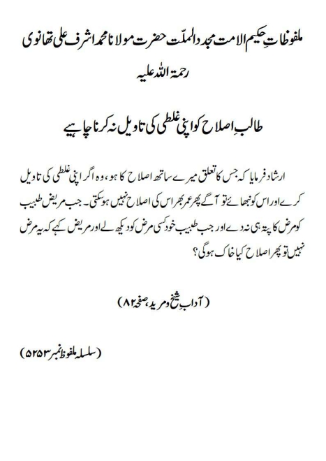 ارشاد فرمایا کہ جس کا تعلق میرے ساتھ اصلاح کا ہو ، وہ اگر اپنی غلطی کی تاویل کرے اور اس کو نبھائے تو آگے پھر عمر بھر اس کی اصلاح نہیں ہوسکتی ۔ جب مریض طبیب کو مرض کا پتہ ہی نہ دے اورجب طبیب خود کسی مرض کو دیکھ لے اور مریض کہے کہ یہ مرض نہیں تو پھر اصلاح کیا خاک ہوگی؟(آداب ِ شیخ و مرید، صفحہ ۸۲)