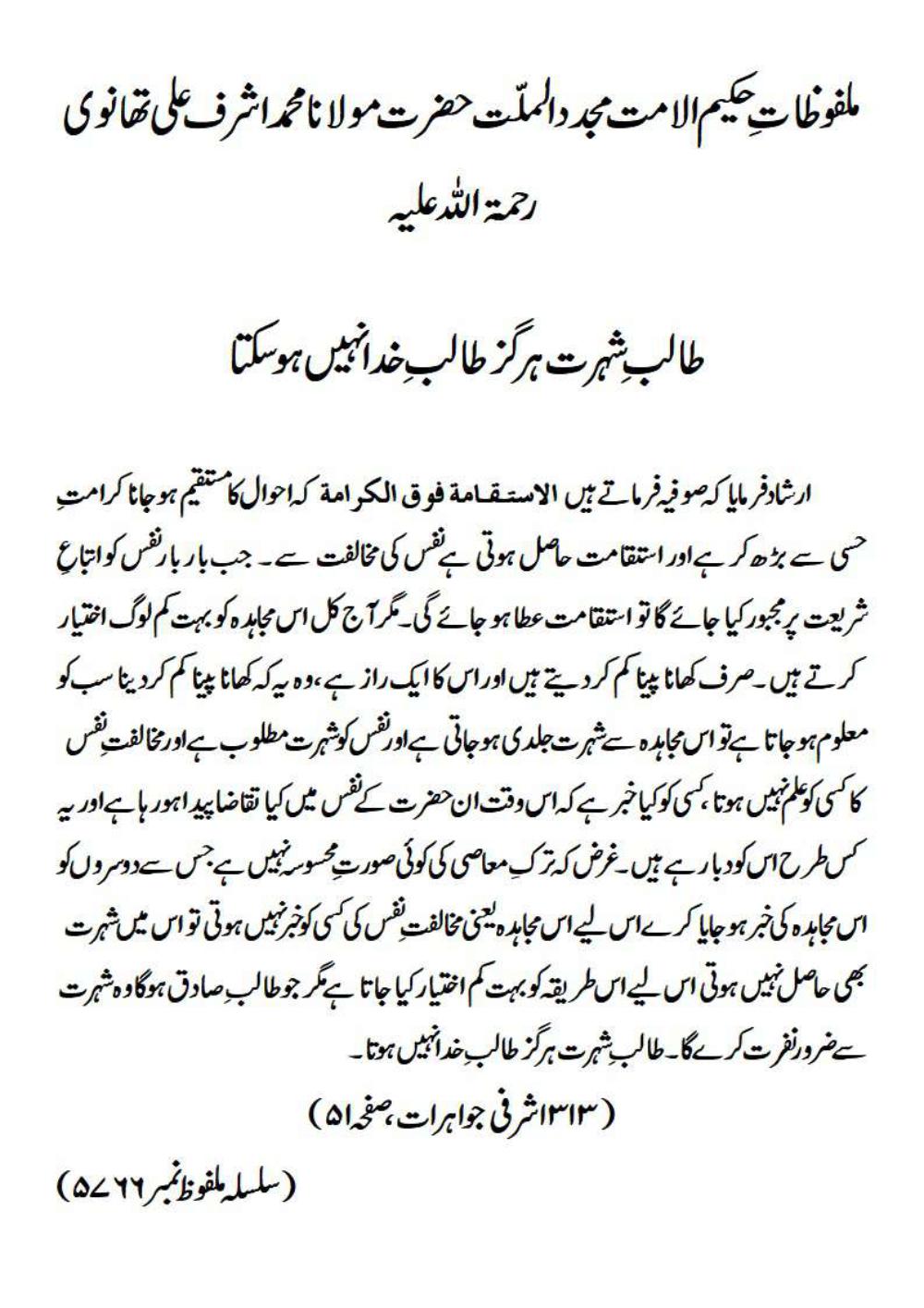 ارشاد فرمایا کہ صوفیہ فرماتے ہیں الاستقامۃ فوق الکرامۃ کہ احوال کا مستقیم ہو جانا کرامت ِ حسی سے بڑھ کر ہے اور استقامت حاصل ہوتی ہے نفس کی مخالفت سے ۔ جب بار بار نفس کو اتباعِ شریعت پر مجبور کیا جائے گا تو استقامت عطا ہو جائے گی۔ مگر آج کل اس مجاہدہ کو بہت کم لوگ اختیار کرتے ہیں ۔ صرف کھانا پینا کم کر دیتے ہیں اور اس کا ایک راز ہے ، وہ یہ کہ کھانا پینا کم کردینا سب کو معلوم ہوجاتا ہے تو اس مجاہدہ سے شہرت جلدی ہوجاتی ہے اور نفس کو شہرت مطلوب ہے اور مخالفت ِ نفس کا کسی کو علم نہیں ہوتا ، کسی کو کیا خبر ہے کہ اس وقت ان حضرت کے نفس میں کیا تقاضا پیدا ہو رہا ہے اور یہ کس طرح اس کو دبا رہے ہیں ۔ غرض کہ ترکِ معاصی کی کوئی صورتِ محسوسہ نہیں ہے جس سے دوسروں کو اس مجاہدہ کی خبر ہوجایا کرے اس لیے اس مجاہدہ یعنی مخالفت ِ نفس کی کسی کو خبر نہیں ہوتی تو اس میں شہرت بھی حاصل نہیں ہوتی اس لیے اس طریقہ کو بہت کم اختیار کیا جاتا ہے مگر جو طالب ِ صادق ہوگا وہ شہرت سے ضرور نفرت کرے گا ۔ طالب ِ شہرت ہرگز طالب ِ خدا نہیں ہوتا۔(۳۱۳ اشرفی جواہرات، صفحہ ۵۱)