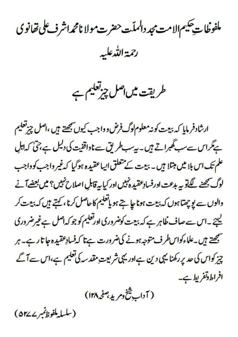 ارشاد فرمایا کہ بیعت کو نہ معلوم لوگ فرض و واجب کیوں سمجھتے ہیں ، اصل چیز تعلیم ہے مگر اس سے سب گھبراتے ہیں ۔ یہ سب طریق سے ناواقفیت کی دلیل ہے ، حتیٰ کہ اہلِ علم تک اس بلا میں مبتلا ہیں ۔ بیعت کے متعلق ایسا عقیدہ ہوگیا کہ غیر واجب کو واجب لوگ سمجھنے لگے تو یہ بدعت اور فسادِ عقیدہ نہیں اور کیا یہ قابلِ اصلاح نہیں؟ میں بعضے آنے والوں سے پوچھتا ہوں کہ بیعت ہونا چاہتے ہو یا تعلیم کا حاصل کرنا، کہتے ہیں کہ بیعت کر لیجئے ۔ اس سے صاف ظاہر ہے کہ بیعت کو ضروری اور تعلیم کو جو کہ اصل ہے غیر ضروری سمجھتے ہیں ۔ علماء کو اس طرف متوجہ ہونے کی ضرورت ہے تاکہ فسادِ عقیدہ جاتا رہے ۔ ہر چیز کو اس کی حد پر رکھنا یہی دین ہے اور یہی شریعت ِ مقدسہ کی تعلیم ہے، اس سے آگے افراط و تفریط ہے۔(آداب ِ شیخ و مرید، صفحہ ۱۲۸)