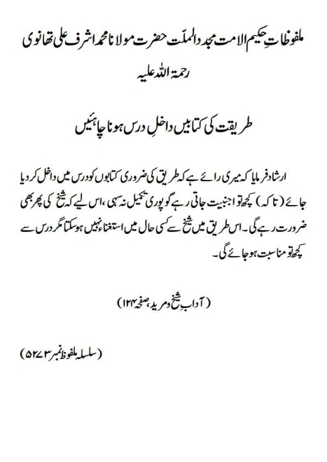 ارشاد فرمایا کہ میری رائے ہے کہ طریق کی ضروری کتابوں کو درس میں داخل کر دیا جائے (تاکہ) کچھ تو اجنبیت جاتی رہے گو پوری تکمیل نہ سہی ، اس لیے کہ شیخ کی پھر بھی ضرورت رہے گی ۔ اس طریق میں شیخ سے کسی حال میں استغناء نہیں ہوسکتا مگر درس سے کچھ تو مناسبت ہو جائے گی۔(آداب ِ شیخ و مرید، صفحہ ۱۲۴)