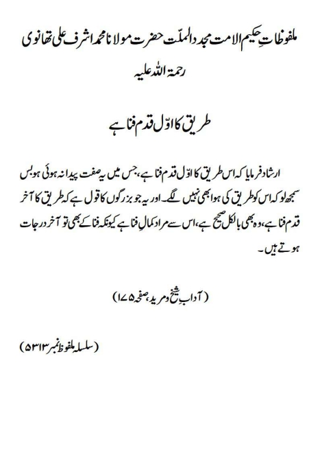 ارشاد فرمایا کہ اس طریق کا اوّل قدم فنا ہے ، جس میں یہ صفت پیدا نہ ہوئی ہو بس سمجھ لو کہ اس کو طریق کی ہوا بھی نہیں لگے۔ اور یہ جو بزرگوں کا قول ہے کہ طریق کا آخر قدم فنا ہے ، وہ بھی بالکل صحیح ہے، اس سے مراد کمالِ فنا ہے کیونکہ فنا کے بھی تو آخر درجات ہوتے ہیں۔(آداب ِ شیخ و مرید، صفحہ ۱۷۵)