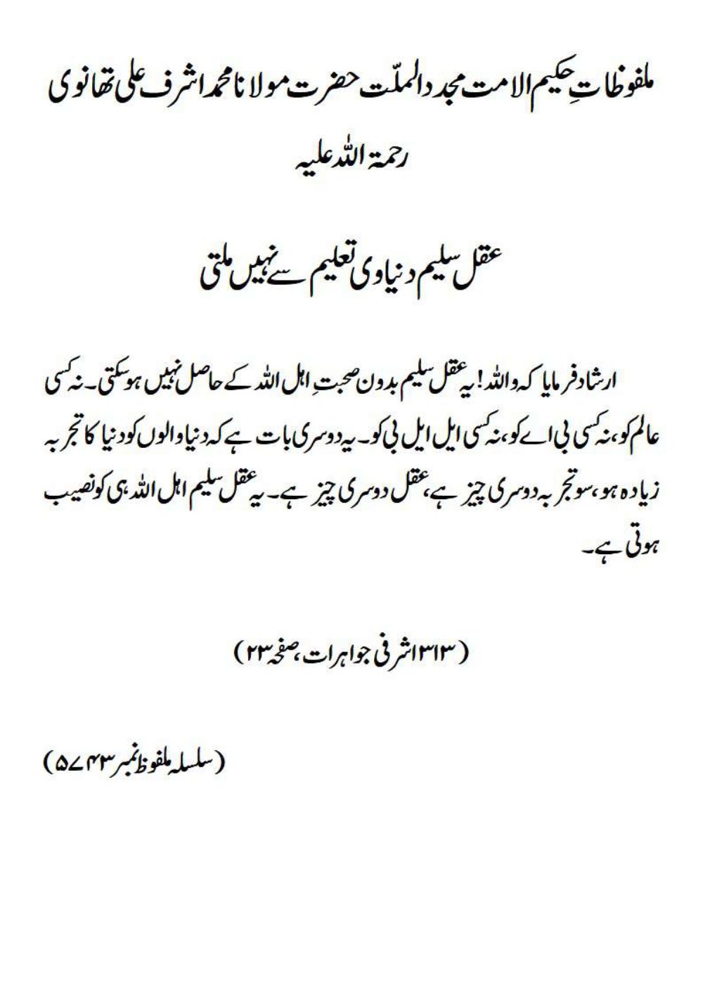 ارشاد فرمایا کہ واللہ ! یہ عقل سلیم بدون صحبت ِ اہل اللہ کے حاصل نہیں ہوسکتی۔ نہ کسی عالم کو، نہ کسی بی اے کو، نہ کسی ایل ایل بی کو۔ یہ دوسری بات ہے کہ دنیا والوں کو دنیا کا تجربہ زیادہ ہو ، سو تجربہ دوسری چیز ہے، عقل دوسری چیز ہے۔ یہ عقل سلیم اہل اللہ ہی کو نصیب ہوتی ہے۔(۳۱۳ اشرفی جواہرات، صفحہ ۲۳)