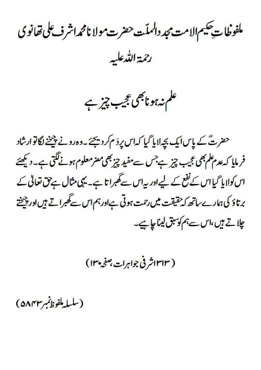 حضرت ؒ کے پاس ایک بچہ لایا گیا کہ اس پر دَم کر دیجئے ۔ وہ رونے چیخنے لگا توارشاد فرمایا کہ عدم علم بھی عجیب چیز ہے جس سے مفید چیز بھی مضر معلوم ہونے لگتی ہے ۔ دیکھئے اس کو لایا گیا اس کے نفع کے لیے اور یہ اس سے گھبراتا ہے ۔ یہی مثال ہے حق تعالیٰ کے برتاؤ کی ہمارے ساتھ کہ حقیقت میں رحمت ہوتی ہے اور ہم اس سے گھبراتے ہیں اور چیختے چلاتے ہیں ، اس سے ہم کو سبق لینا چاہیے۔(۳۱۳ اشرفی جواہرات، صفحہ۱۳۲)