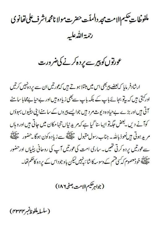ارشاد فرمایا کہ بعضے پیر بھی اس میں مبتلا ہوتے ہیں کہ عورتیں ان سے پردہ نہیں کرتیں اور کہتی ہیں کہ یہ تو بجائے باپ کے بلکہ باپ سے بھی زیادہ ہیں اور بے حیا بے محابا سامنے آتی ہیں اور بڑے بے حیا وہ دیوث مرد ہیں جو ایسے پیروں کے سامنے اپنی بیٹیوں بہوؤں کو آنے دیں ۔ بعض جگہ تو ایسا سنا گیا ہے کہ مریدنیاں تنہا مکان میں جاتی ہیں اور وہاں مرید ہوتی ہیںنعوذباﷲ۔جناب رسول مقبول ﷺ سے زیادہ کون ہوگا ۔ حضور ﷺ سے عورتیں پردہ کرتی تھیں۔ ساری امت کی عورتیں آپ کی روحانی بیٹیاں اور حضور ﷺ خود معصوم کہ کسی قسم کے وسوسہ کا شائبہ نہیں لیکن باوجود اس کے پردہ کا حکم تھا۔ (جواہر حکیم الامت،صفحہ ۱۸۶)