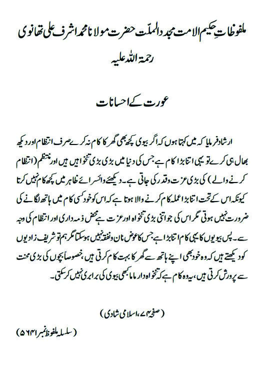 ارشاد فرمایا کہ میں کہتا ہوں کہ اگر بیوی کچھ بھی گھر کا کام نہ کرے صرف انتظام اور دیکھ بھال ہی کرے تو یہی اتنا بڑا کام ہے جس کی دنیا میں بڑی بڑی تنخواہیں ہیں اور منتظم (انتظام کرنے والے) کی بڑی عزت و قدر کی جاتی ہے ۔ دیکھئے وائسرائے ظاہر میں کچھ کام نہیں کرتا کیونکہ اس کے تحت اتنا بڑا عملہ کام کرنے والا ہوتا ہے کہ اس کو خود کسی کام میں ہاتھ لگانے کی ضرورت نہیں ہوتی مگر اس کی جو اتنی بڑی تنخواہ اور عزت ہے محض ذمہ داری اور انتظام کی وجہ سے ۔ پس بیویوں کا یہی کام اتنا بڑا ہے جس کا عوض نان و نفقہ نہیں ہوسکتا مگر ہم تو شریف زادیوں کو دیکھتے ہیں کہ وہ خود بھی اپنے ہاتھ سے گھر کا بہت کام کرتی ہیں، خصوصاًبچوں کی بڑی محنت سے پرورش کرتی ہیں ، یہ وہ کام ہے کہ تنخواہ دار ماما کبھی بیوی کی برابری نہیں کر سکتی۔(صفحہ ۷۴،اسلامی شادی)