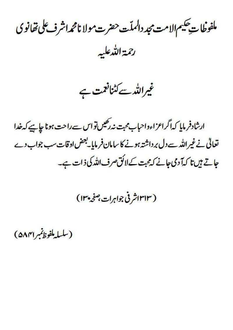ارشاد فرمایا کہ اگر اعزاء و احباب محبت نہ رکھیں تو اس سے راحت ہونا چاہیے کہ خدا تعالیٰ نے غیر اللہ سے دل برداشتہ ہونے کا سامان فرمایا۔ بعض اوقات سب جواب دے جاتے ہیں تاکہ آدمی جانے کہ محبت کے لائق صرف اللہ کی ذات ہے۔(۳۱۳ اشرفی جواہرات، صفحہ۱۳۰)