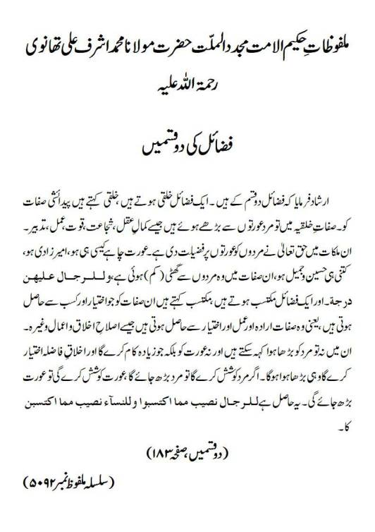 ارشاد فرمایا کہ فضائل دو قسم کے ہیں ۔ ایک فضائل خلقی ہوتے ہیں ، خلقی کہتے ہیں پیدائشی صفات کو۔ صفاتِ خلقیہ میں تو مرد عورتوں سے بڑھے ہوئے ہیں جیسے کمالِ عقل، شجاعت، قوت، عمل ، تدبیر۔ ان ملکات میں حق تعالیٰ نے مردوں کو عورتوں پر فضیلت دی ہے ۔ عورت چاہے کیسی ہی ہو ، امیر زادی ہو، کتنی ہی حسین و جمیل ہو ، ان صفات میں وہ مردوں سے گھٹی (کم) ہوئی ہے، وللرجال علیھن درجۃ۔اور ایک فضائل مکتسب ہوتے ہیں،مکتسب کہتے ہیں ان صفات کو جو اختیار اور کسب سے حاصل ہوتی ہیں ، یعنی وہ صفات ارادہ اور عمل اور اختیار سے حاصل ہوتی ہیں جیسے اصلاحِ اخلاق و اعمال وغیرہ۔ ان میں نہ تو مرد کو بڑھا ہوا کہہ سکتے ہیں اور نہ عورت کو بلکہ جو زیادہ کام کرے گا اور اخلاقِ فاضلہ اختیار کرے گا وہی بڑھا ہوا ہوگا۔ اگر مرد کوشش کرے گا تو مرد بڑھ جائے گا ، عورت کوشش کرے گی تو عورت بڑھ جائے گی۔ یہ حاصل ہے للرجال نصیب مما اکتسبوا وللنسآء نصیب مما اکتسبن کا۔(دو قسمیں، صفحہ ۱۸۳)