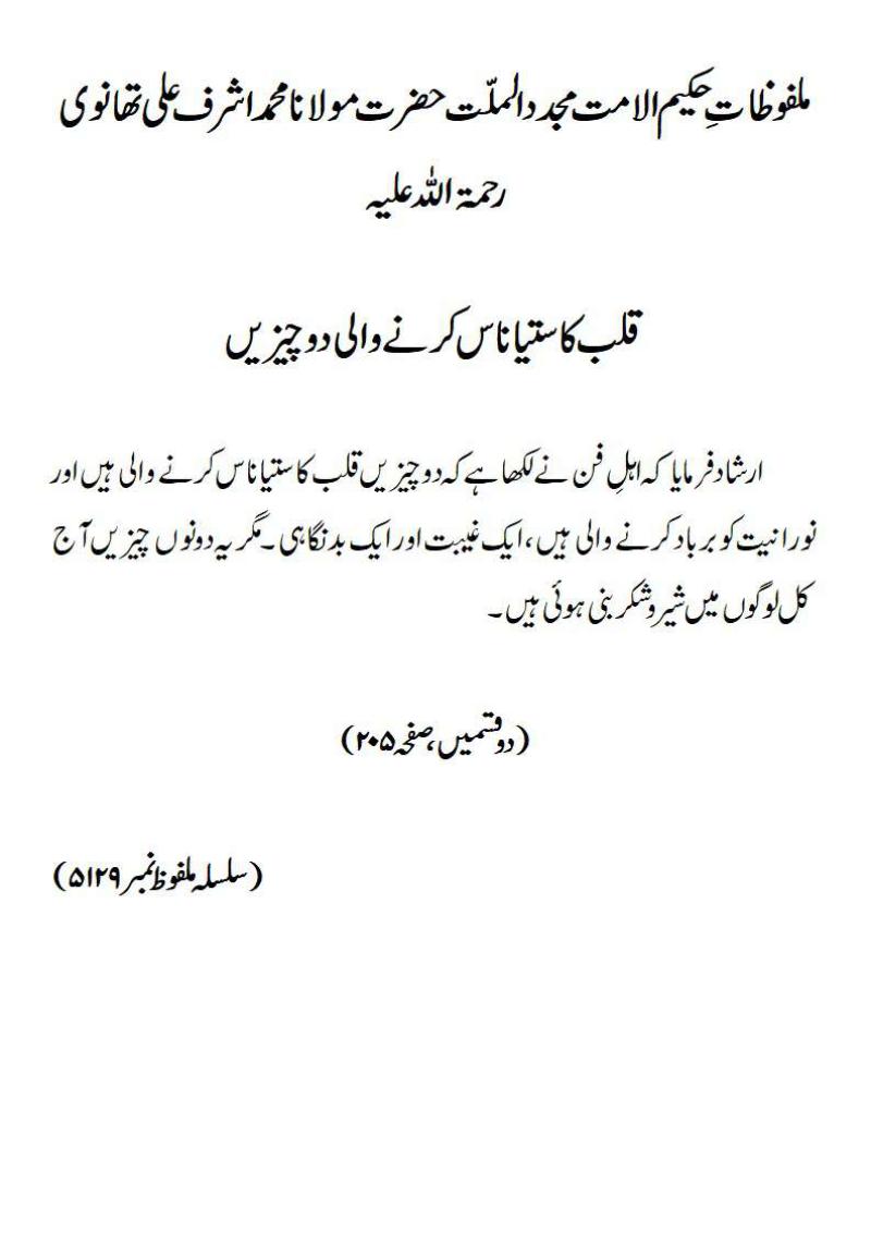 ارشاد فرمایا کہ اہلِ فن نے لکھا ہے کہ دوچیزیں قلب کا ستیاناس کرنے والی ہیں اور نورانیت کو برباد کرنے والی ہیں، ایک غیبت اور ایک بدنگاہی ۔ مگر یہ دونوں چیزیں آج کل لوگوں میں شیر و شکر بنی ہوئی ہیں۔(دو قسمیں، صفحہ ۲۰۵)