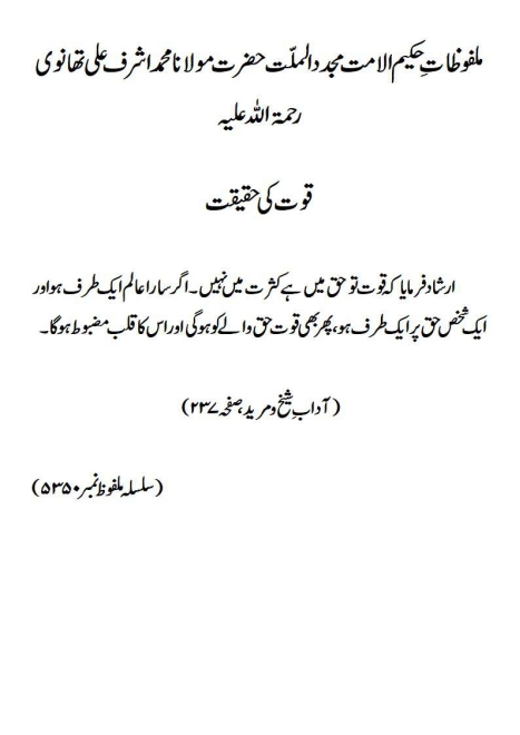 ارشاد فرمایا کہ قوت تو حق میں ہے کثرت میں نہیں۔ اگر سارا عالم ایک طرف ہو اور ایک شخص حق پر ایک طرف ہو ، پھر بھی قوت حق والے کو ہوگی اور اس کا قلب مضبوط ہوگا۔(آداب ِ شیخ و مرید، صفحہ ۲۳۷)