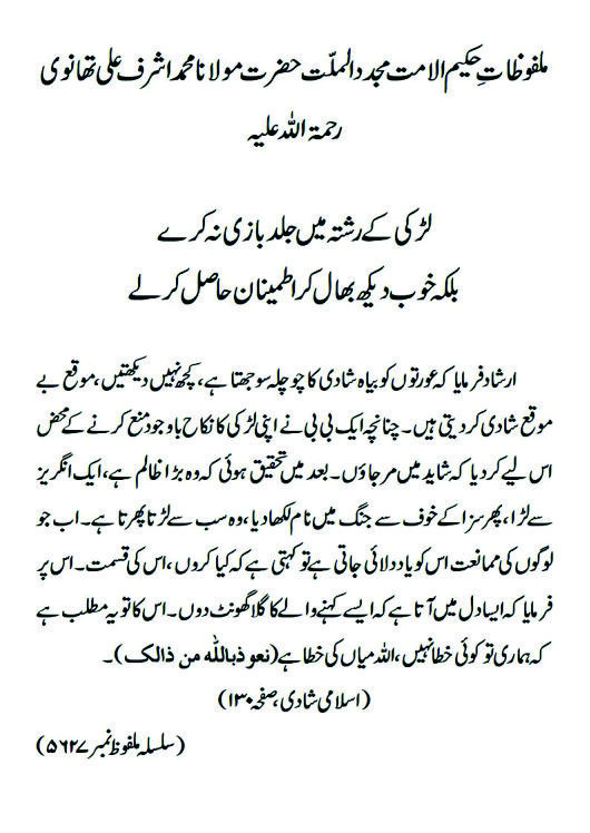 لڑکی کے رشتہ میں جلد بازی نہ کرے بلکہ خوب دیکھ بھال کر اطمینان حاصل کرلے
