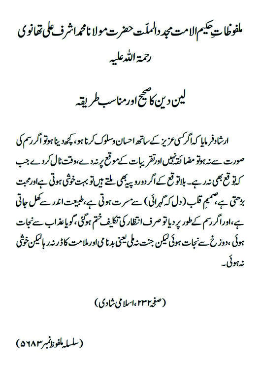 ارشاد فرمایا کہ اگر کسی عزیز کے ساتھ احسان و سلوک کرنا ہو ، کچھ دینا ہو تو اگر رسم کی صورت سے نہ ہو تو مضائقہ نہیں اور تقریبات کے موقع پر نہ دے ، وقت ٹال کر دے جب کہ توقع بھی نہ رہے ۔ بلا توقع کے اگر دو روپیہ بھی ملتے ہیں تو بہت خوشی ہوتی ہے اور محبت بڑھتی ہے ، صمیمِ قلب (دل کہ گہرائی) سے مسرت ہوتی ہے ، طبیعت اندر سے کھل جاتی ہے ، اور اگر رسم کے طور پر دیا تو صرف انتظار کی تکلیف ختم ہوگئی ، گویا عذاب سے نجات ہوئی ، دوزخ سے نجات ہوئی لیکن جنت نہ ملی یعنی بدنامی اور ملامت کا ڈر نہ رہا لیکن خوشی نہ ہوئی۔(صفحہ ۲۳۲،اسلامی شادی)