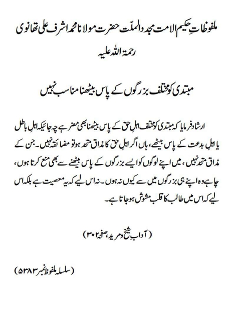 ارشاد فرمایا کہ مبتدی کو مختلف اہلِ حق کے پاس بیٹھنا بھی مضر ہے چہ جائیکہ اہلِ باطل یا اہلِ بدعت کے پاس بیٹھے، ہاں اگر اہلِ حق کا مذاق متحد ہو تو مضائقہ نہیں۔ جن کے مذاق متحد نہیں ، میں اپنے لوگوں کو ایسے بزرگوں کے پاس بیٹھنے سے بھی منع کرتا ہوں، چاہے وہ اپنے ہی بزرگوں میں سے کیوں نہ ہوں ۔ نہ اس لیے کہ یہ معصیت ہے بلکہ اس لیے کہ اس میں طالب کا قلب مشوش ہوجاتا ہے۔(آداب ِ شیخ و مرید، صفحہ ۳۰۲)