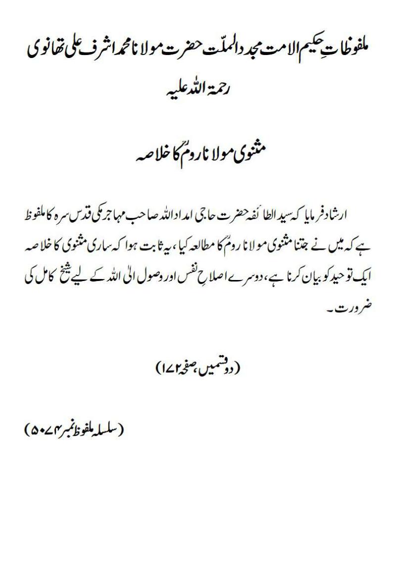 ارشاد فرمایا کہ سید الطائفہ حضرت حاجی امداد اللہ صاحب مہاجر مکی قدس سرہ کا ملفوظ ہے کہ میں نے جتنا مثنوی مولانا رومؒ کا مطالعہ کیا ، یہ ثابت ہوا کہ ساری مثنوی کا خلاصہ ایک توحید کو بیان کرنا ہے ، دوسرے اصلاحِ نفس اور وصول الیٰ اللہ کے لیے شیخ کامل کی ضرورت۔(دو قسمیں، صفحہ ۱۷۲)