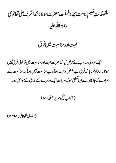 ایک مولوی صاحب نے عرض کیا کہ حضرت محبت اور مناسبت میں تو کوئی فرق نہیں ہوتا ۔ارشاد فرمایا کہ فرق ہے ، بعض کو محبت ہوتی ہے مناسبت نہیں ہوتی۔ مناسبت سے مراد ہے کہ جانبین سے ایسا تعلق ہو کہ ہر بات ایک دوسرے کے مذاق کے موافق ہو۔(آداب ِ شیخ و مرید، صفحہ ۱۷۹)