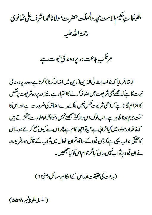 ارشاد فرمایا کہ جو احداث فی الدّین(دین میں اضافہ کرنا) کرتا ہے وہ درپردہ مدعی نبوت کا ہے کہ مجھے بھی شریعت میں اضافہ کرنے کا اختیار ہے ۔ نیز درپردہ شریعت پر نقص کا الزام لگاتا ہے کہ ابھی شریعت مکمل نہیں بلکہ میرے اضافہ کی ضرورت ہے اور اس کا سخت جرم ہونا ظاہر ہے۔ اب لوگ اس راز کو تو سمجھتے نہیں ، خواہ مخواہ علماء سے جھگڑتے ہیں کہ فاتحہ اور مولود میں کیا خرابی ہے؟ یہ تو اچھا کام ہے پھر اس سے کیوں منع کرتے ہو۔ اس کا حقیقی جواب یہی ہے کہ جن قیود کے ساتھ تم ان افعال میں ثواب کے قائل ہو ، شریعت نے ان قیود پر ثواب نہیں بیان کیا مگر عوام اس کو کیا سمجھیں۔(بدعت کی حقیقت اور اس کے احکام و مسائل، صفحہ ۶۲)