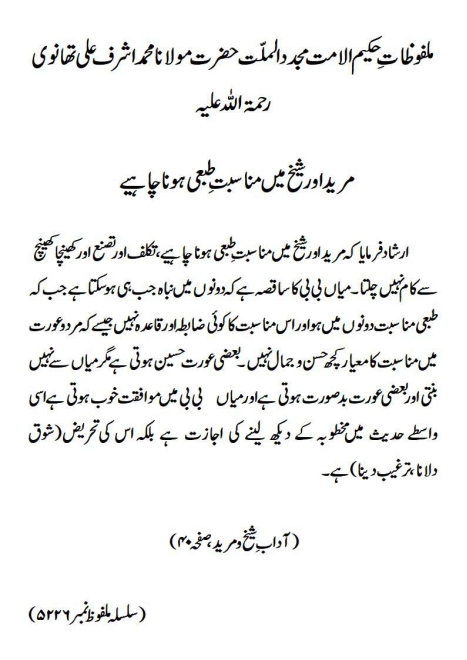 ارشاد فرمایا کہ مرید اور شیخ میں مناسبت ِ طبعی ہونا چاہیے، تکلف اور تصنع اور کھینچا کھینچ سے کام نہیں چلتا۔ میاں بی بی کا سا قصہ ہے کہ دونوں میں نباہ جب ہی ہوسکتا ہے جب کہ طبعی مناسبت دونوں میں ہو اور اس مناسبت کا کوئی ضابطہ اور قاعدہ نہیں جیسے کہ مرد و عورت میں مناسبت کا معیار کچھ حسن و جمال نہیں۔ بعضی عورت حسین ہوتی ہے مگر میاں سے نہیں بنتی اور بعضی عورت بد صورت ہوتی ہے اور میاں بی بی میں موافقت خوب ہوتی ہے اسی واسطے حدیث میںمخطوبہ کے دیکھ لینے کی اجازت ہے بلکہ اس کی تحریض(شوق دلانا،ترغیب دینا) ہے ۔(آداب ِ شیخ و مرید، صفحہ ۴۰)