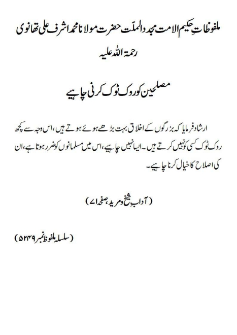 ارشاد فرمایا کہ بزرگوں کے اخلاق بہت بڑھے ہوئے ہوتے ہیں، اس وجہ سے کچھ روک ٹوک کسی کو نہیں کرتے ہیں ۔ ایسا نہیں چاہیے، اس میں مسلمانوں کو ضرر ہوتا ہے ، ان کی اصلاح کا خیال کرنا چاہیے۔(آداب ِ شیخ و مرید، صفحہ ۷۱)